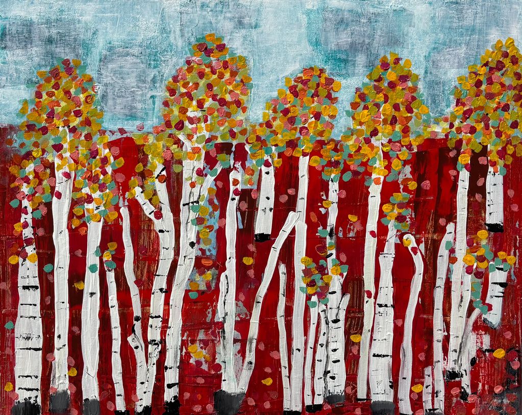 Fall colors of the sky, foliage, and aspen trees in this abstract painting